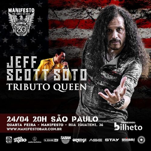 Não demorou muito, mais precisamente às 22:00, para que BJ (teclado/guitarra), Leo Mancini (guitarra), Henrique Canalle (baixo) e Edu Cominato (bateria) se posicionassem no palco, para receber a estrela maior: JEFF SCOTT SOTO. Com a chegada do artista, os fãs foram tomados de assalto com a trinca inicial do Queen “One Vision”, “Another One Bites the Dust” e “I Want to Break Free”. Como é bom poder rever o norte-americano com ascendência porto-riquenha em ação. Mesmo com o hábito de sempre encher a cara de caipiroskas, nas suas apresentações por aqui, mantém a voz em plena forma. Impressionante!